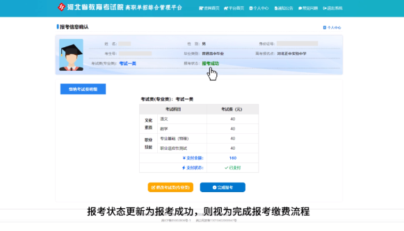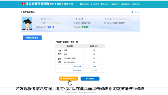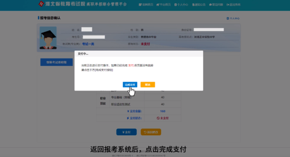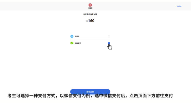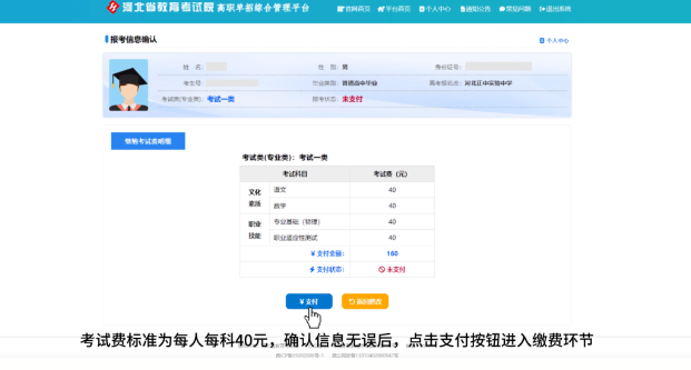 考試費標(biāo)準(zhǔn)為每人每科40元,確認(rèn)信息無誤后,點擊支付按鈕進入繳費環(huán)節(jié)。