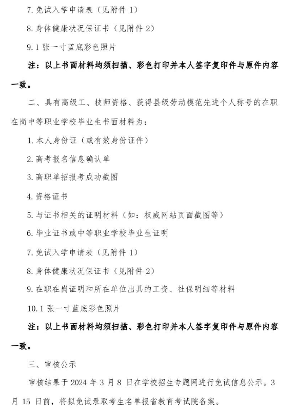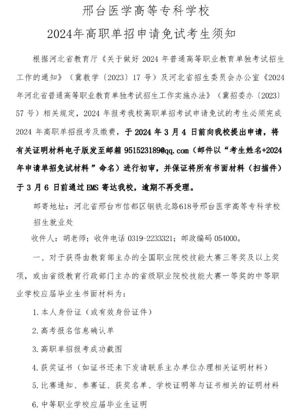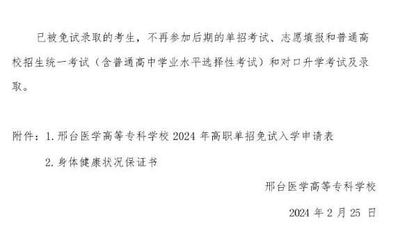 邢臺醫學高等專科學校2024年高職單招申請免試考生須知