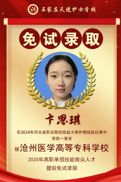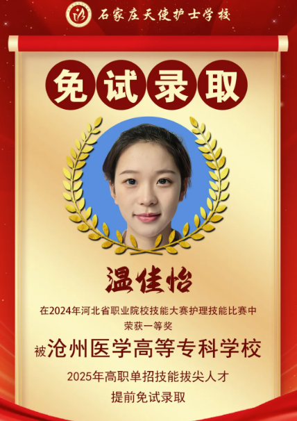 石家莊天使護士學校學生徐嘉琪、王繼魯、韓少文獲得由教育部主辦的世界職業院校技能大賽爭奪賽銀獎,溫嘉怡、卞思琪獲得由省級教育行政部門主辦的省級職業院校技能大賽一等獎。根據河北省教育廳《關于做好 2025 年普通高等職業教育單獨考試招生工作的通知》 (冀教學〔2024〕11 號)及河北省教育考試院《2025 年河北省普通高等職業教育單獨考試招生工作實施辦法》相關規定,在2025年高職單招技能拔尖人才選拔中被滄州醫學高等專科學校免試錄取。