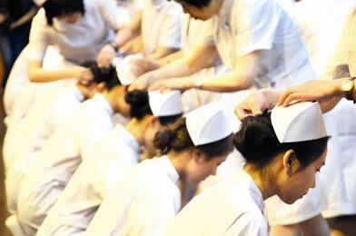 護士節前夕,杭師大邀請在杭各大醫院護理部主任來校,為2014級護理專業學生授帽。157名護生從前輩手中接過蠟燭,戴上圣潔的燕帽。