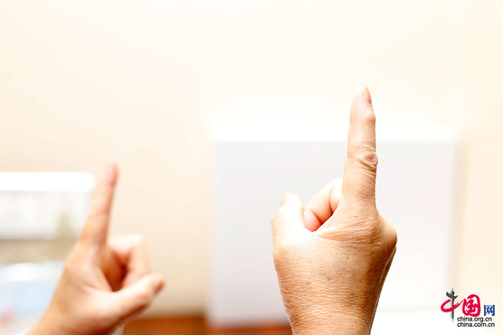 護理院里90多位老人,三天要進行一次排便檢查,如果無法正常排便就需要人工輔助。長期為老人摳便,導致易連軍手指變形彎曲,無法伸直。