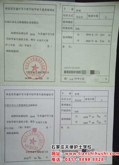 石家莊天使護士學校就業報到證