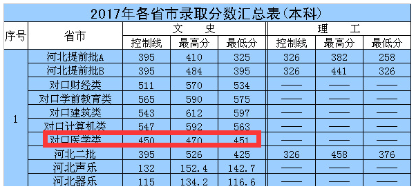 最低分就是河北省對口醫學類本科控制線,而從上面的河北本科二批的錄取分數看,最低分要高于控制線29分,所以相對普通高考來說,對口升學更 一些。
