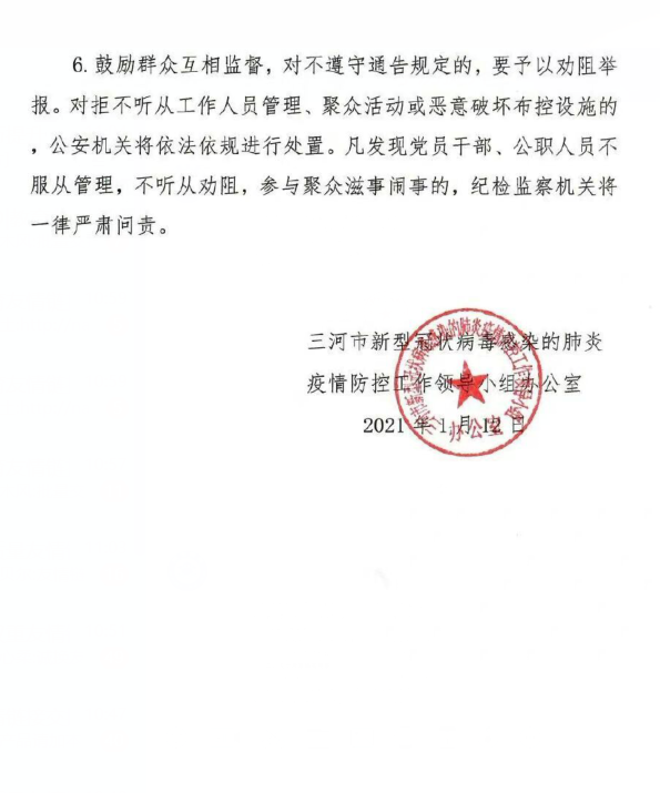 1月12日,河北三河市新型冠狀病毒感染的肺炎疫情防控工作領導小組辦公室發布關于開展全員核酸檢測和居家隔離觀察的通告。#河北疫情# 來源:燕趙都市報